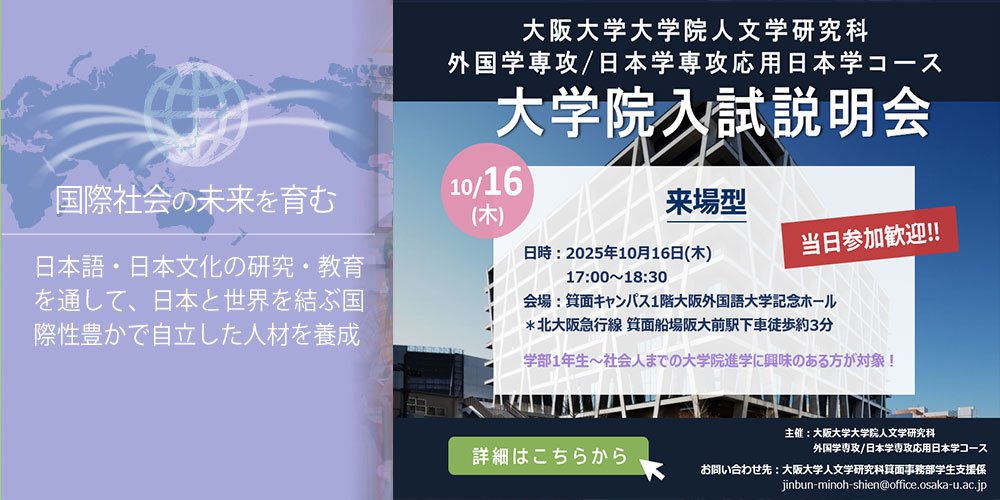 - 【入試情報】令和8(2026)年度人文学研究科日本学専攻応用日本学コース(4月入学)の学生募集要項を掲載しました